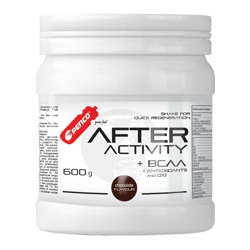 Příchuť – ČOKOLÁDA Špičkový regenerační nápoj s výrazným účinkem a unikátní směsí jednoduchých sacharidů, volných BCAA, syrovátkových proteinů, koenzymu Q10 a antioxidantů. Výrazně zkracuje dobu regenerace. Vhodný pro všechny typy sportů. Rychlé doplnění energetických zásob (glykogenu) S antioxidanty (vitamíny C a E a stopovými prvky Zn, Mn a Se), které přispívají k ochraně buněk před oxidativním stresem S vitamínem C  pro normální funkce imunitního systému Maximální podpora výstavby svalové tkáně Výrazné zkrácení doby regenerace PENCO AFTER ACTIVITY Q10 je energetický regenerační nápoj, obnovující po zátěži (tréninku, závodu či nadměrné fyzické námaze) rovnováhu v organizmu. Doplňuje zásoby glykogenu ve svalech a játrech, a tím pomáhá předcházet potréninkovým katabolickým procesům. Energii dodávají jak jednoduché cukry (sacharóza, glukóza), tak i výše molekulární polysacharidy, aminokyseliny a proteiny. Bílkovinnou složkou jsou syrovátkové proteiny s vysokou biologickou hodnotou, které se poměrně rychle resorbují a pomáhají přepnout katabolický proces na anabolický. Pro urychlení regenerace je PENCO AFTER ACTIVITY Q10 obohacen směsí volných aminokyselin BCAA (Branched Chain Amino Acids), které chrání svalovou tkáň a podporují anabolizmus. Jedna dávka regeneračního nápoje PENCO AFTER ACTIVITY Q10 poskytuje 350 mg směsi volných BCAA v ideálním poměru 50% leucinu, 30% valinu a 20% isoleucinu. Receptura navíc obsahuje aktivní látky s antioxidačním účinky (vitamíny C a E a stopové prvky zinek, mangan a selen), které přispívají k ochraně buněk před oxidativním stresem, jehož riziko roste s intenzitou fyzické zátěže. Koenzym Q10 je nejen účinný antioxidant, ale hraje také zásadní roli při získávání energie pro další metabolické pochody. Nejenom účinný trénink, ale i odpovídající regenerace dlouhodobě přispívají ke zlepšení výkonu! Složení: syro­vátka sušená, sacharóza, maltodextriny, dextróza, aroma, emulgátor: sójový  lecithin, kakao (pouze AA čoko), slunečnicový olej, L-leucin, zahušťovadlo xanthanová guma, L-valin, β karoten, L-isoleucin, vitamínová směs (L-askorbová kyselina, tokoferyl-acetát 50%, nikotinamid, D-pantothenát vápenatý, riboflavin, pyridoxin-hydrochlorid, thiamin-mononitrát, kyselina pteroylmonoglu­tamová, D-biotin, kyanokobalamin),  oxid zinečnatý, přírodní barvivo E120 (pouze AA jahoda), koenzym Q10, síran manganatý, seleničitan sodný. Minerály jsou přirozenou součástí přítomných proteinů a sacharidů.  Upozornění pro alergiky: výrobek obsahuje laktózu. DÁVKOVÁNÍ: Asi 30–50g (2–3 odměrky) prášku se rozmixuje ve 250–350 ml chladné vody nebo mléka. Pijte ihned po zátěži, nejlépe do 15 min. Výživové údaje/Nutritional  Dates   pro 100 g %RHP/ RI*/ pro 50 g %RHP/ RI*/ 50 g 100 g Energetická  hodnota/Energy content kJ 1590 19 795 9,5 kcal 379 19 190 9,5 Tuky/Fats g 4 6 2 3 z toho nasycené mastné kyseliny/from that saturated fatty acids g 0,4 2 0,2 1 Sacharidy/Sac­charides/ g 78 30 39 15 z toho cukry/from that sugars g 52 58 26 29 Bílkoviny/ g 7 14 3,5 7 Proteins Sůl/Soľ/Salt g 2 33 1 17             Vitamíny/Vitamins A µg 333 42 166 21 C mg 225 281 112,5 140 E mg 24 200 12 100 B1 mg 0,6 54 0,3 27 B2 mg 2,1 150 1,05 75 B6 mg 0,8 57 0,4 28 B12 µg 3 120 1,5 60 Kys. listová/folic acid µg 60 30 30 15 Kys. pantothenová/pan­tothenic acid mg 8,8 147 4,4 73 Niacin mg 6,5 40 3,25 20 Biotin µg 80 160 40 80             Koenzym Q10/Coenzyme Q10 mg 4   2               Minerální látky/Minerals Sodík/Na mg 780   390   Draslík/K mg 1120 56 560 28 Vápník/Ca mg 540 68 270 34 Hořčík/Mg mg 110 29 55 15 Fosfor/P mg 420 60 210 30 MěďCu mg 0,2 20 0,1 10 Zinek/Zn mg 7,5 75 3,75 37 Mangan/Mn mg 1 50 0,5 25 Selen/Se µg 24 44 12 22             Aminokyselinový profil/Amino Acids profile/ Izoleucin/Ile mg 620   310   Leucin/Leu mg 1080   540   Lysin/Lys mg 620   310   Methionin/Met mg 120   60   Fenylalanin/Phe mg 270   135   Treonin/Thr mg 550   275   Tryptofan/Trp mg 140   70   Valin/Val mg 706   353   Arginin/Arg mg 210   105   Histidin/His mg 110   55   Alanin/Ala mg 330   165   Asparágová kys./Asp mg 810   405   Cystein/Cys mg 90   45   Glutamová kys./Glu mg 1300   650   Glycin/Gly mg 110   55   Prolin/Pro mg 230   115   Serin/Ser mg 350   175   Tyrosin/Tyr mg 260   130   RHP- Referenční hodnota příjmu/ RI – Reference Intake     *Referenční hodnota příjmu u průměrné dospělé osoby/     Reference intake of an average adult (8 400kJ/ 2 000kcal).     ** RHP nestanoveno/ RI not given         ** 50g = 1 porce/porci­a/portion    BCAA = Val + Leu + Ile